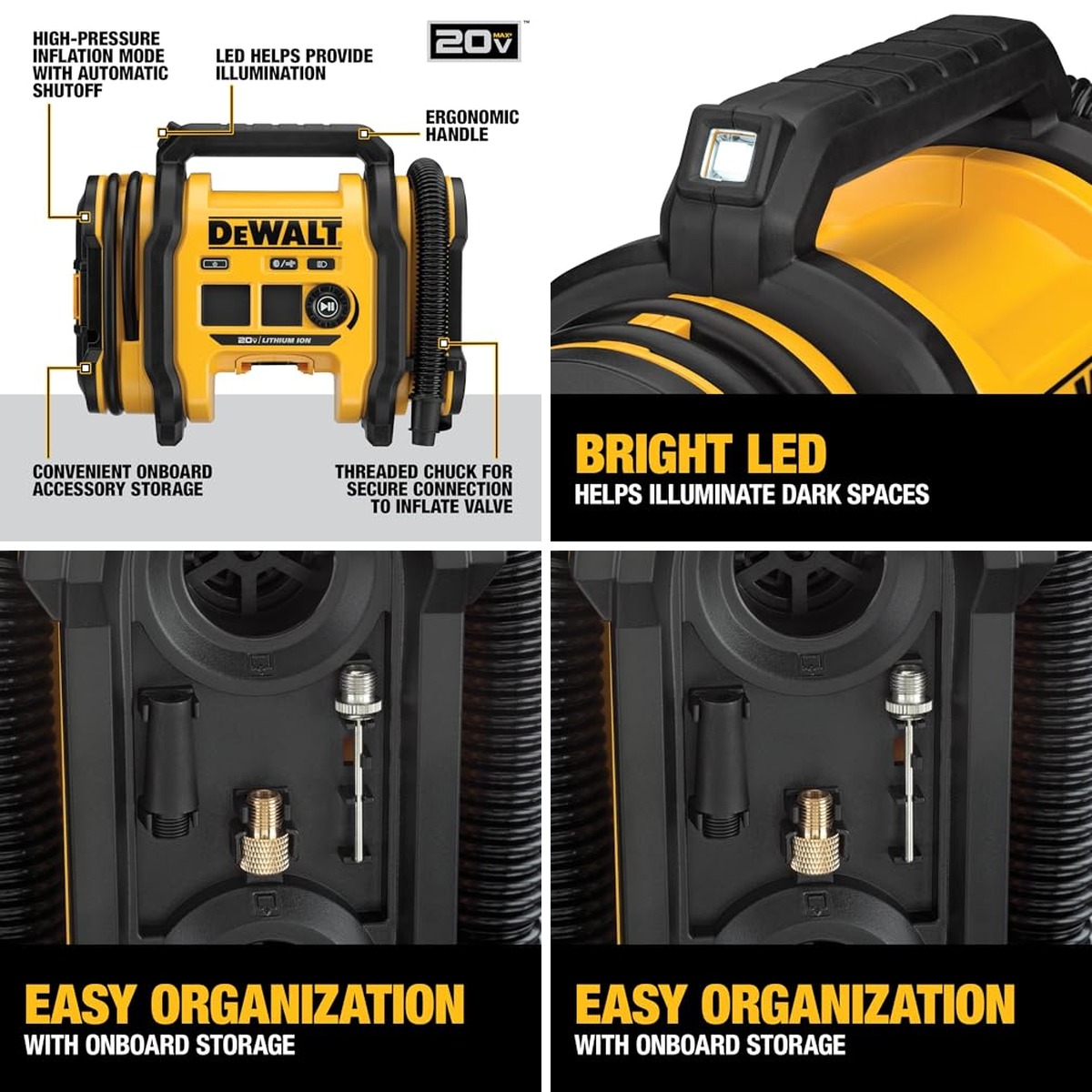 Product | DEWALT Tire Inflator Portable Air Compressor 20V MAX, Air Pump with Automatic Shut Off, LED Light, Tool Only (DCC020IB) DEWALT | AstroAI Tire Inflator Portable Air Compressor Air Pump for Car Tires-Car Accessories, 9.8Ft Cord-12V DC-Powered Auto Pump with Digital Pressure Gauge, Emergency LED Light for Bicycle, Balloons, Yellow AstroAI | PORTER-CABLE Air Compressor, 6-Gallon, Pancake, Oil-Free (C2002-ECOM) PORTER-CABLE |