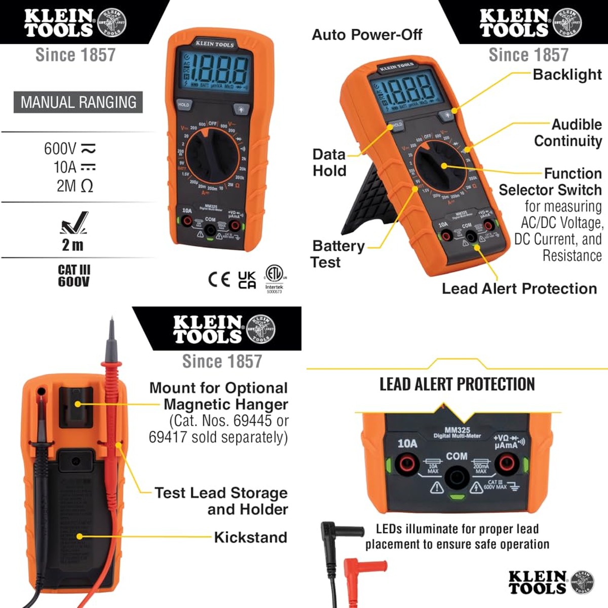 Klein Tools MM325 Multimeter, Digital Manual-Ranging 600V AC/DC Voltage Tester, Tests Batteries, Current, Resistance, Diodes, and Continuity