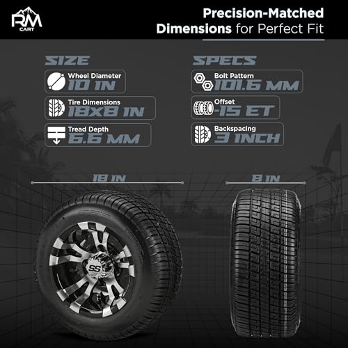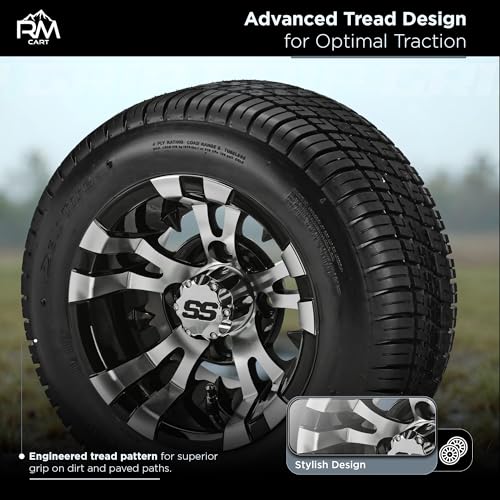 RM Cart 10″ Warlock Black/Machined on 205/50-10 Deli Low Profile Tires (Set of 4) | Golf Cart Tires and Wheels Combo with Metric Lug Nuts