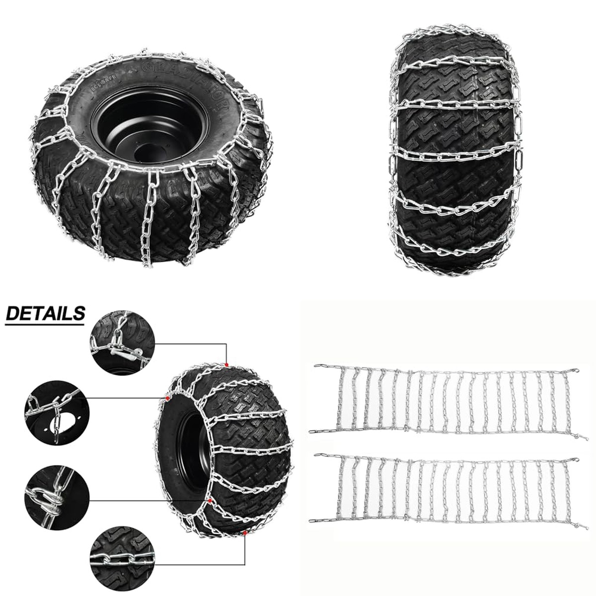 These chains are designed to enhance traction and maneuverability for snow blowers and garden tractors on challenging terrains like snow, ice, and mud.