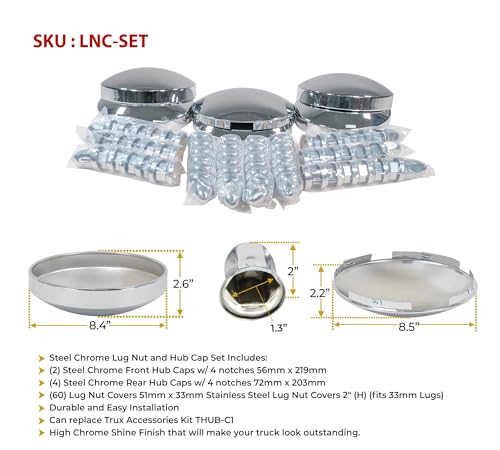 Mytee Products Steel Chrome Axle Wheel Cover Set - Includes (2) Front Hub Caps, (4) Rear Hub Caps, (60) Lug Nut Covers 33mm for Semi Truck | Axle Cover Combo Kit