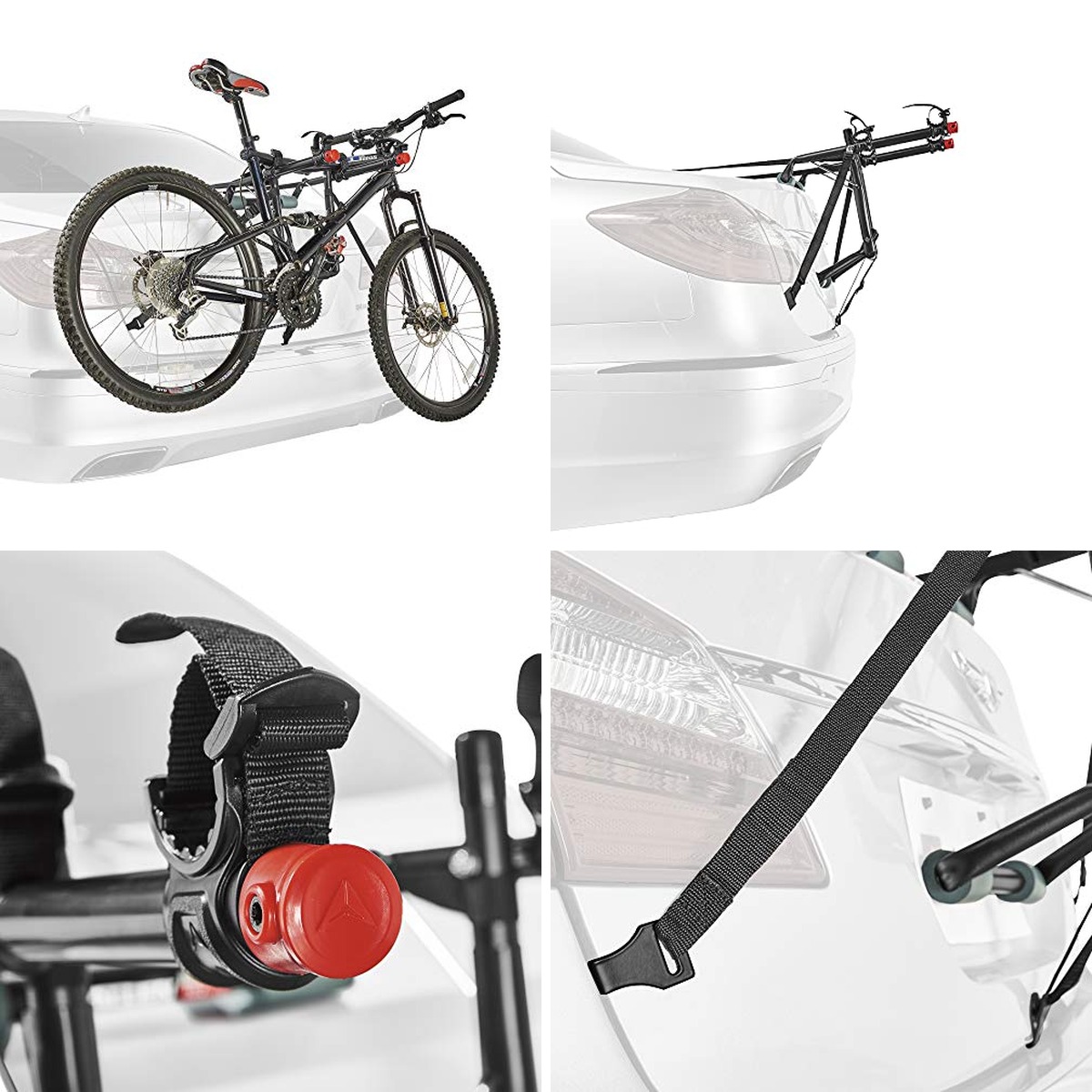 Key Features | – Patented design fits most sedans, hatchbacks, minivans, and SUVs. – Individual tie downs secure and protect bicycles. | – Patented design fits sedans, hatchbacks, minivans, and SUVs. – Side straps for increased lateral stability. – Individual tie downs secure and protect bicycles. | – Lightweight aluminum construction. – Foldable arm for easy storage. – Secure locking mechanism. |
