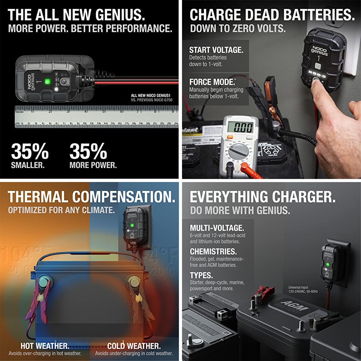 NOCO GENIUS1: 1A 6V/12V Smart Battery Charger – Automatic Maintainer, Trickle Charger & Desulfator with Overcharge Protection & Temperature Compensation – For Lead-Acid & Lithium Batteries