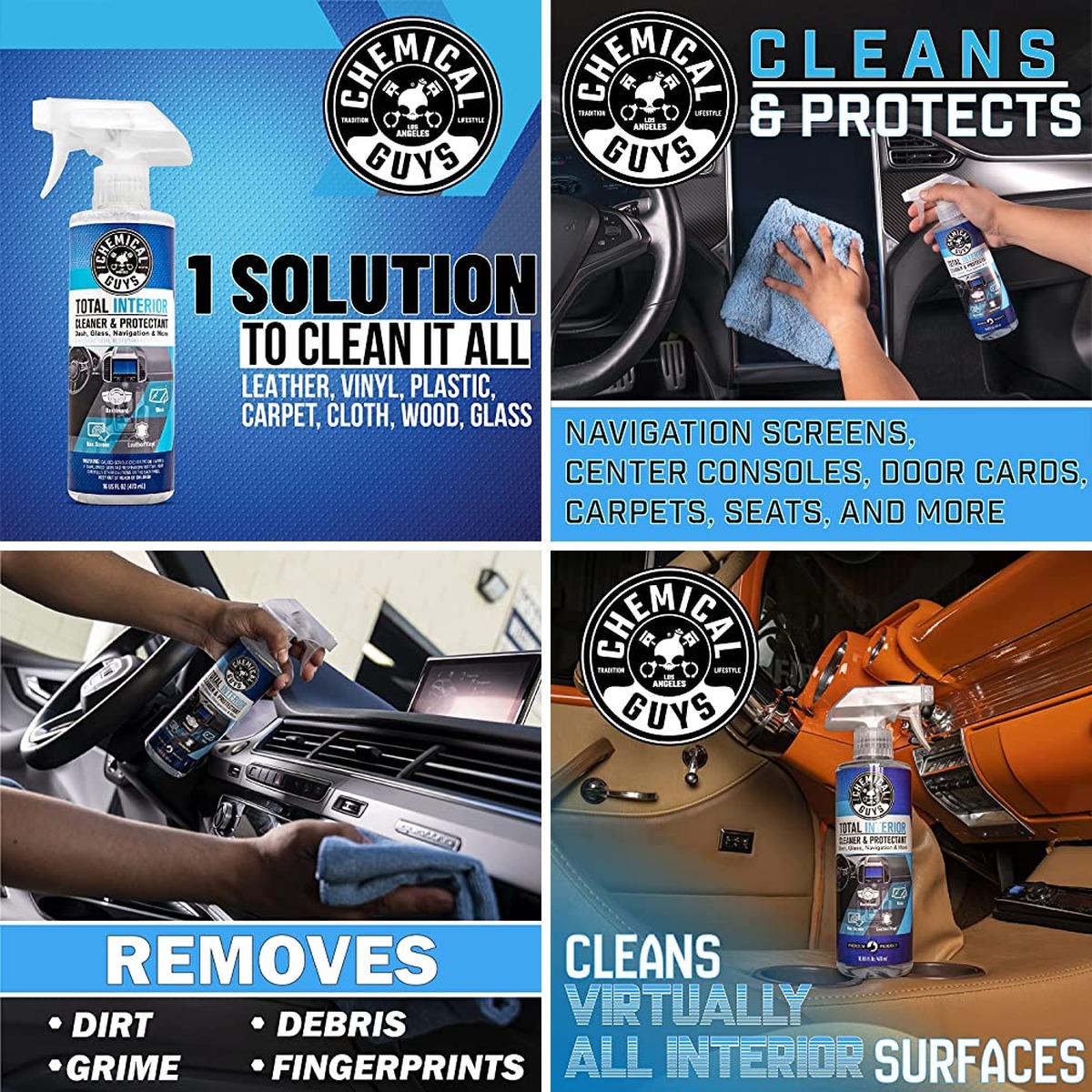 Product | Chemical Guys Total Interior Cleaner & Protectant, Cleans & Protects Leather, Vinyl, Plastic, Rubber & Glass Streak-Free Finish for Cars, Trucks, SUVs, RVs & More – 16 oz Chemical Guys | 17pcs Car Detailing Kit Interior Cleaner, Car Interior Cleaning Kit with Handheld Car Vacuum, Car Detailing Brushes, Windshield Cleaning Tool, Car Cleaning Supplies, Car Accessories for Men, Women NIKCOSMK | THINKWORK Car Cleaning Kit Car Detailing Kit,Car Cleaning Kit Interior Cleaner with High Power Blue Handheld Vacuum Cleaner,Brush Sets,Windshield Cleaner and Storage Bag,Car Accessories,Car Gift Set THINKWORK |