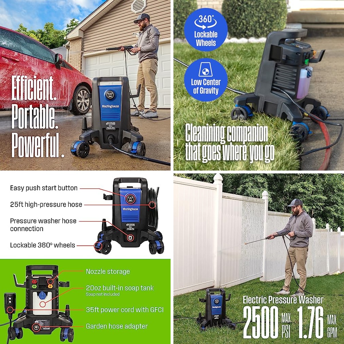 Product | Westinghouse ePX3500 Electric Pressure Washer, 2500 Max PSI 1.76 Max GPM with Anti-Tipping Technology, Onboard Soap Tank, Pro-Style Steel Wand, 5-Nozzle Set, for Cars/Fences/Driveways/Home/Patios Westinghouse | Westinghouse ePX3100v Electric Pressure Washer, 2100 Max PSI 1.76 Max GPM, Built-in Carry Handle, Detachable Foam Cannon, Pro-Style Steel Wand, 3-Nozzle Set, for Cars/Fences/Driveways/Home/Patios Westinghouse | 1800 PSI 1.2 GPM Electric Jet Cleaner Car Wash System, 13 Amp Motor, Portable Automotive Cleaning Kit with 3 Quick-Connect Attachments, Lightweight Compact Design – Compatible with Bauer Systems Generic |