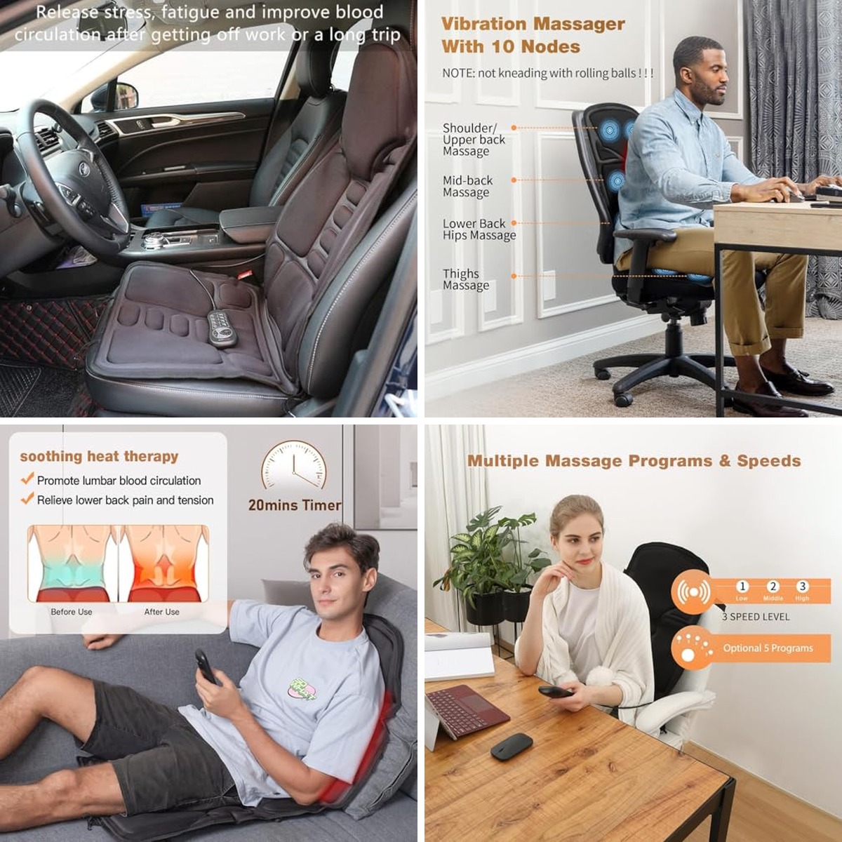 - Soothing Heated Chair Massager – Offers deep tissue vibration for full-body comfort and portability for use in various locations.