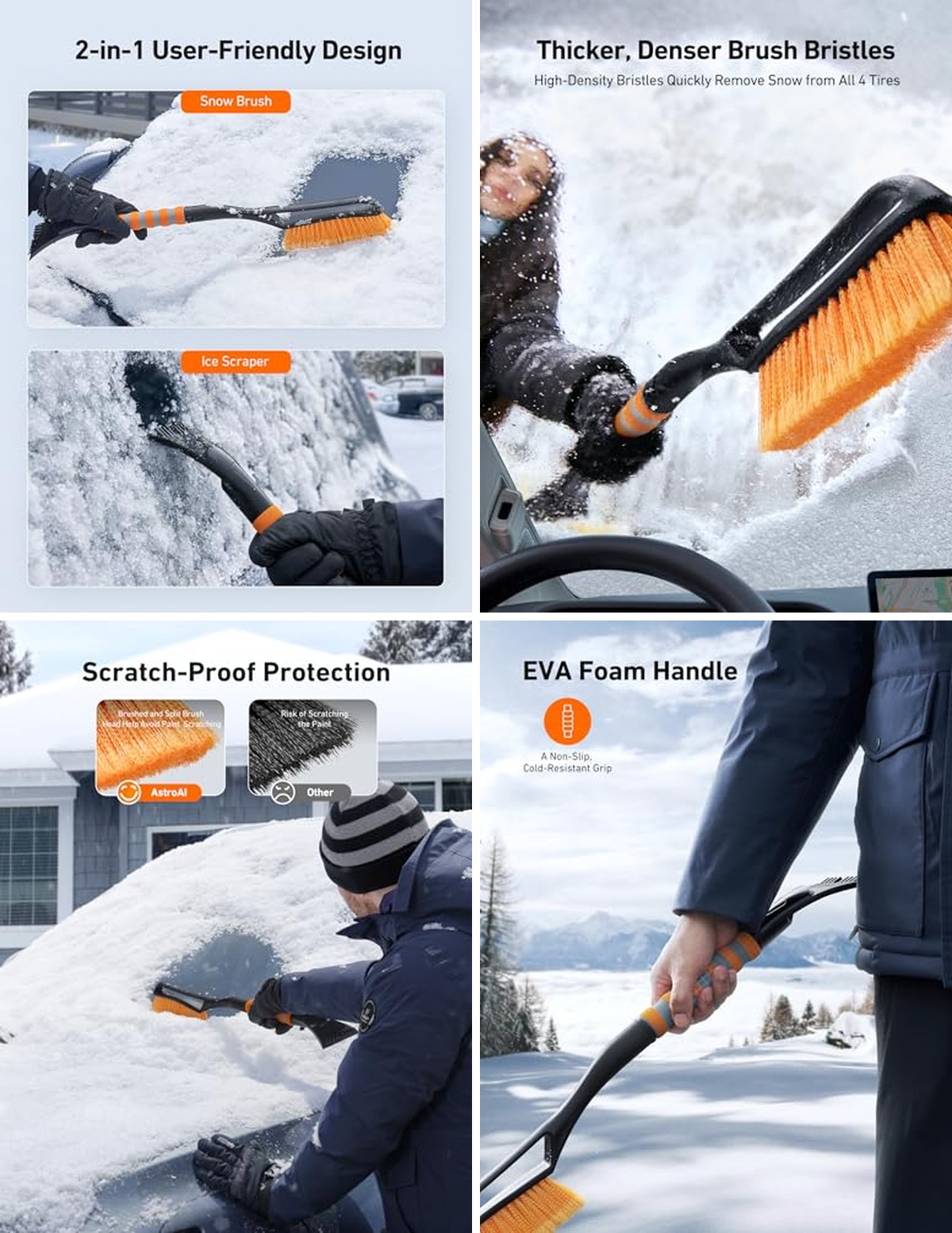 Product | AstroAI 27″ Snow Brush and Ice Scrapers for Car Windshield, Detachable Snow Scrapers with Ergonomic Foam Grip for Cars, Trucks, SUVs (Heavy Duty ABS, PVC Brush, Orange) AstroAI | Snow Joe 18″ Telescoping Snow Broom & Ice Scraper for Car Windows, No-Scratch Foam Brush – Long and Extendable Ice Removal Tool for Window and Windshield – Automotive Cleaning Accessories, SJBLZD Snow Joe | helloleiboo 39.4″ Extendable Ice Scrapers for Car Windshield for 12 Adjustable Length Settings with Foam Grip and 360° Pivoting Brush Head Detachable Snow Brush for Truck SUV(Blue) helloleiboo |
