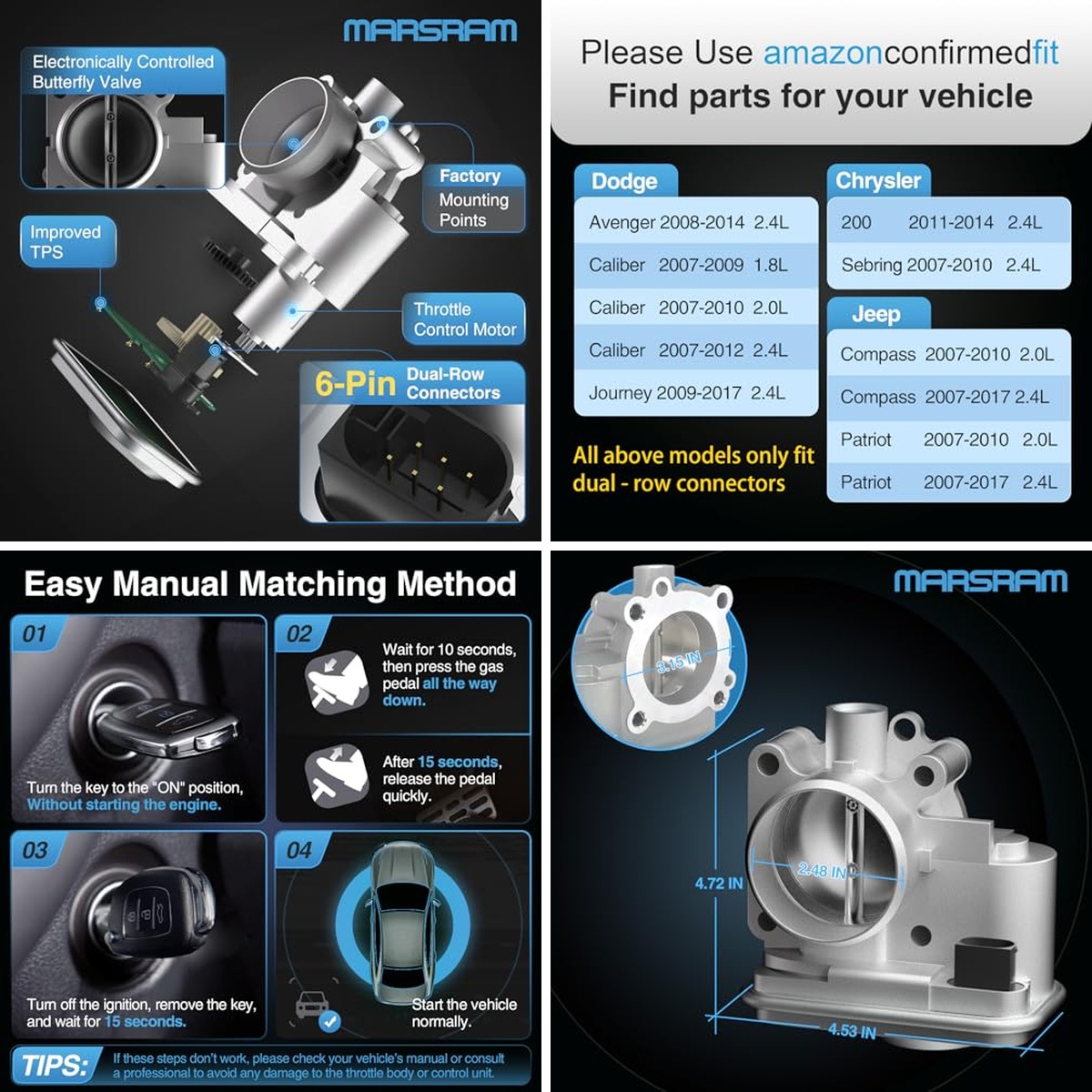 Product | Marsram Electronic Throttle Body for Dodge Avenger Caliber Journey, Chrysler 200 Sebring, Jeep Compass Patriot, 1.8L 2.0L 2.4L Throttle Body Replacement OE Number: 4891735AC 4891735AD 977-025 Marsram | A-Premium Electronic Throttle Body Compatible with Ford, Lincoln & Mercury Models – Escape 2009-2018, Fusion, Ranger, MKZ, C-Max, Mariner, Milan, Transit Connect – 2.0L 2.5L 3.0L – Replace# 9L8Z9E926A A-Premium | A-Premium Throttle Body Assembly with TPS Sensor Compatible with Ford Fiesta 2011 2012 2013 2014 2015 2016 L4 1.6L A-Premium |