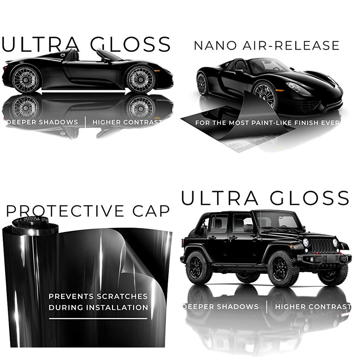 Product | VViViD+ Ultra Gloss Premium Vinyl Car Wrap Film (1ft x 5ft, Gloss Piano Black) VViViD | VViViD+ Ultra Gloss Premium Vinyl Car Wrap Film (1.5ft x 5ft, Gloss Piano Black) VViViD | VViViD Matte Black Vinyl Wrap Adhesive Film Air Release Decal Sheet (1ft x 5ft) VViViD |