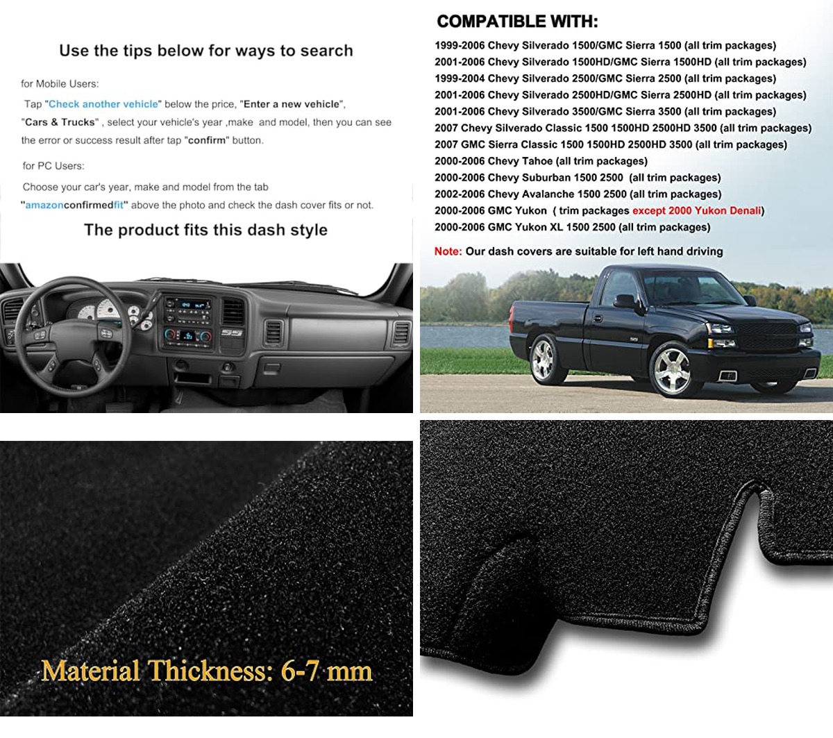 Product | Dash Cover Mat Fit for 1999-2006 GMC Sierra/Chevy Chevrolet Silverado 1500 2500 3500 HD,2000-2006 GMC Yukon/Yukon XL/Chevy Suburban Tahoe Avalanche,Dashboard Pad Carpet (99-06 Black) Y44 Yiz | Dash Cover Custom Fit for Chevy Chevrolet Silverado 1500 LT/WT 2007-2013 2500 HD / 3500 HD/GMC Sierra 2007-2013 .Dashboard Cover Mat Pad Carpet (08-13, Black) Y74 Yiz | Dash Cover Mat Custom Fit for Chrysler Pacifica Without Speaker Dashboard Pad Cap Carpet Protector K271 (Black) AKMOTOR |