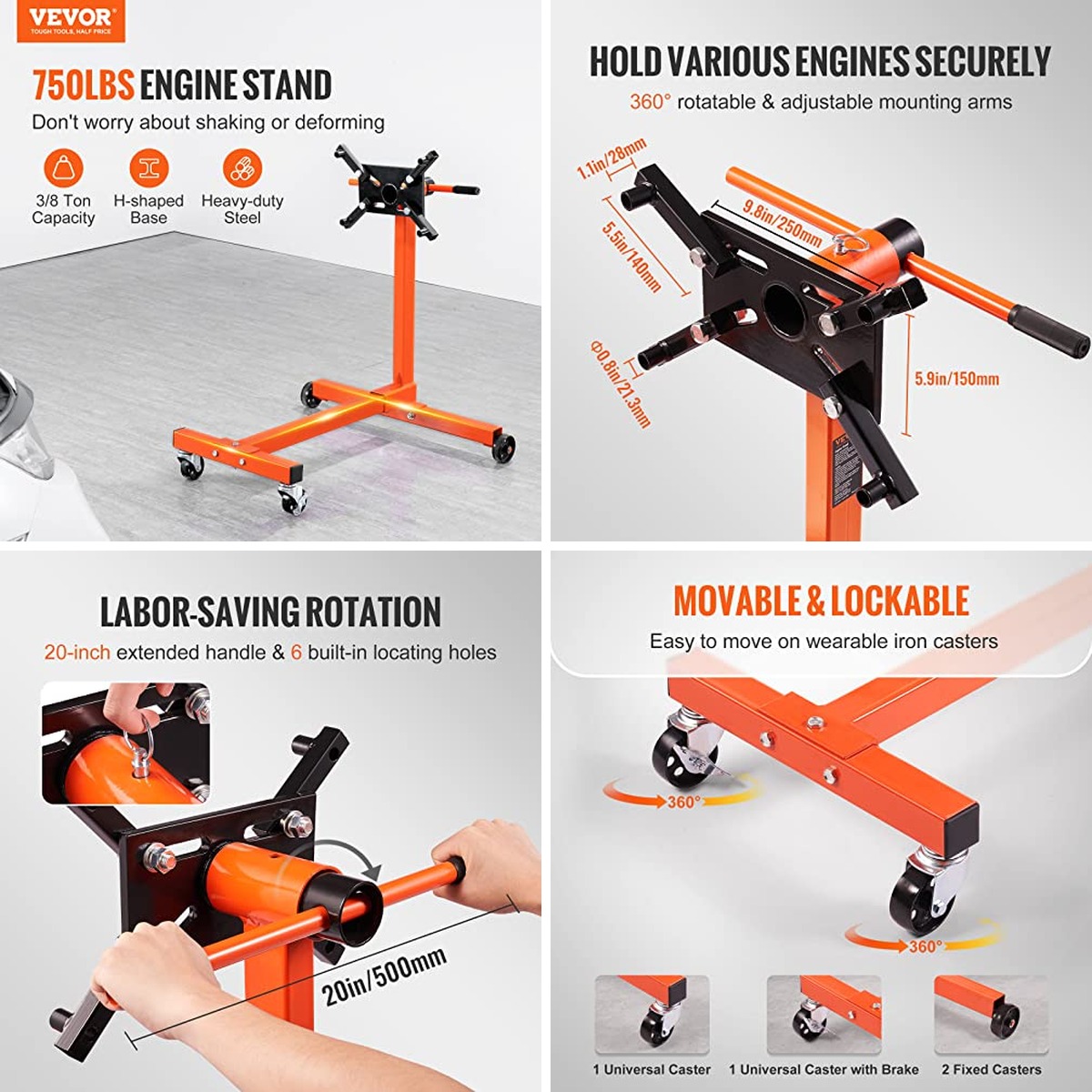 VEVOR Engine Stand, 750 lbs (3/8 Ton) Rotating Engine Motor Stand with 360 Degree Adjustable Head, Cast Iron Motor Hoist Dolly, 4-Caster, 4 Adjustable Arms,…