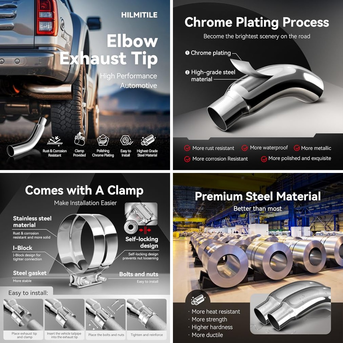 Product | HILMITILE Exhaust Tip, 4 Inch Diesel Exhaust Tip Elbow Tip with a Clamp, 4″ inlet 6″ Outlet Chromed Exhaust Tip for Pickups, Trucks and Cars HILMITILE | Stainless Steel Car Exhaust Tip, 2.5″ Inlet 3.3″ Outlet Adjustable Chrome-Plated Finish Exhaust Tailpipe, Car Exhaust Pipe Modification Tail Throat Tail Pipe, Fit for Most Cars (Straight, Silver) smilfuy | Qurbuns Car Exhaust Tip, 1.9″-2.8″ Inlet Adjustable 3″ Outlet Muffler Tip with Adapters, Stainless Steel Straight Exhaust Tail Tip, Sport Modified Accessories for 1.9″-2.8″ OD Tailpipe (Silver) Qurbuns |