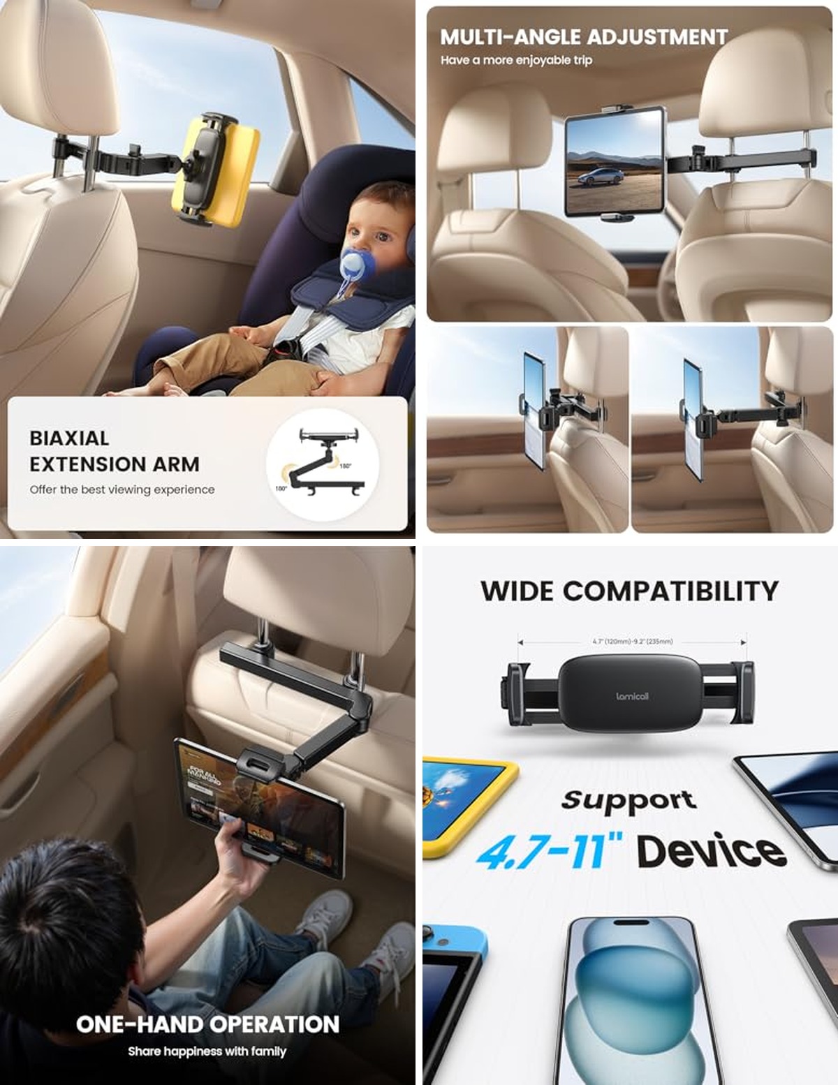 ![Lamicall Car Headrest Tablet Holder - [3 in 1 Extension Arm] Adjustable Tablet Car Mount for Back Seat, Road Trip Essentials for Kids, for 4.7-11" Device Like iPad Pro, Air, Mini, Galaxy, Fire, Black](https://m.media-amazon.com/images/I/41W3pd+rvOL._SS520_.jpg)