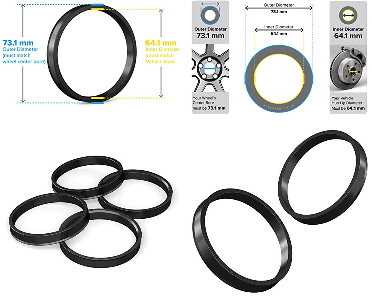Product | StanceMagic Hubcentric Rings (Pack of 4) – 64.1mm ID to 73.1mm OD – Black Poly Carbon Plastic Hubrings Hub – Only Compatible with Honda Acura with 64.1mm Vehicle Hubs and 73.1mm Wheel Centerbore StanceMagic | WHEEL CONNECT Hub Centric Rings 73.1 to 64.1, Aluminium Alloy Hubrings 64.1 to 73.1,Set of 4, O.D:73.1-I.D:64.15 (64.1) mm. A WHEEL CONNECT | WHEEL CONNECT Hub Centric Rings, 106 to 78.1, Set of 4, ABS Plastic Hubrings, O.D:106 (106.1) – I.D:78.1mm. WHEEL CONNECT |
