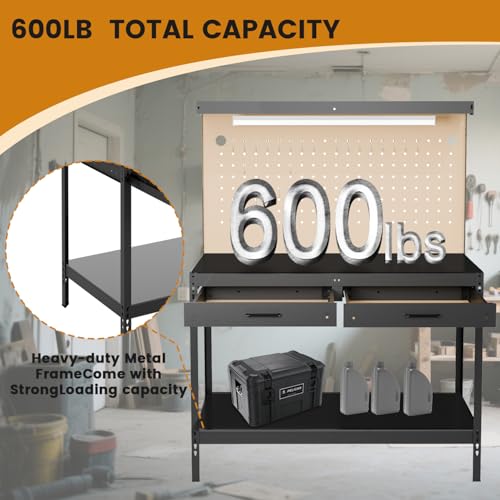 Eltean 48" Work Bench,Heavy Duty 2000 LBS Capacity Workbench with Drawers and Storage,Work Table with Light & Pegboard,Work Benches for Garage