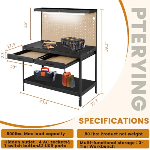 Work Bench, Work Benches for Garage, Work Table, A3 Steel 600LBS Capacity Workbench for Garage Tool Storage Workshop Basement, Tool Table Bench