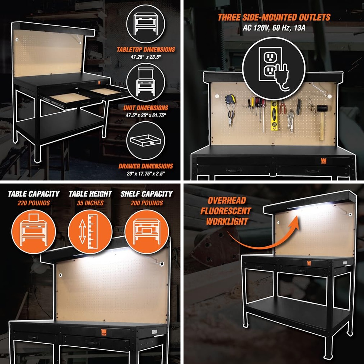 WEN WB4723T 48-Inch Workbench with Power Outlets and Light, Black