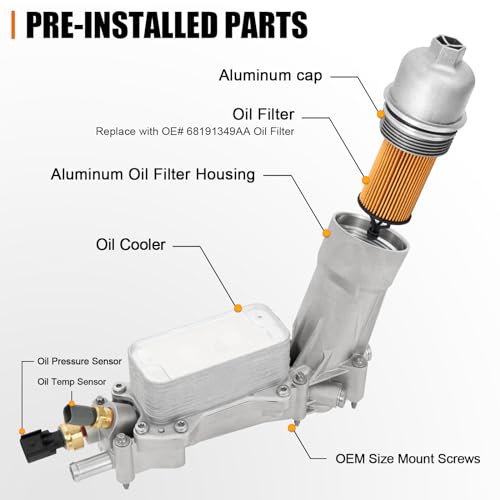 Best ForReplacement of plastic oil filter housing for Chrysler/Dodge/Jeep/Ram 3.6L engines.Upgraded replacement for 2011+ Chrysler, Dodge, Jeep, and Ram vehicles with Pentastar engines.Replacement for 2019-2020 Jeep, Dodge, Chrysler, Ram 3.6L V6 engines.