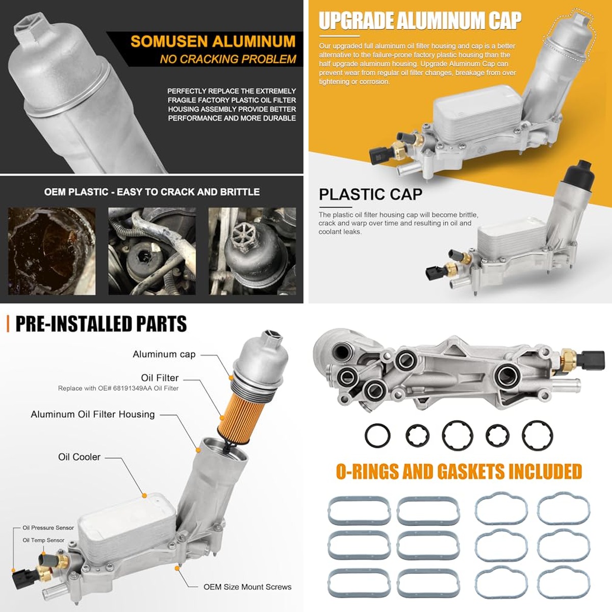 Best ForReplacement of plastic oil filter housing for Chrysler/Dodge/Jeep/Ram 3.6L engines.Upgraded replacement for 2011+ Chrysler, Dodge, Jeep, and Ram vehicles with Pentastar engines.Replacement for 2019-2020 Jeep, Dodge, Chrysler, Ram 3.6L V6 engines.