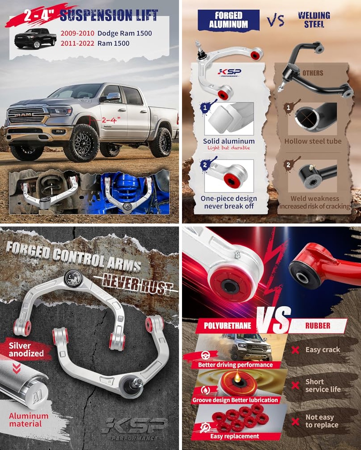 Product | KSP 2-4″ Ram 1500 Forged Upper Control Arms, Adjustable Aluminum Front UCA Fit Dodge Ram 1500 2009-2022, 2pcs One-piece Design Silver Aftermarket Control Arms With Greasable Ball Joint KSP PERFORMANCE | KSP 2-4inch Upper Control Arms Compatible with F-150, Suspension Kits Tubular Black Arms Alignment Lift 2 to 4” for 2004-2020 F150, Replacement Factory/Stock Suspension Arms, 2nd Generation KSP PERFORMANCE | KSP 4Runner Upper Control Arm, 2-4in Adjustable Front Control Arm Compatible with Toyota FJ Cruiser Land Cruiser Prado J120 J150, Aftermarket Arm Replace Stock A-arm After 2-4″ Lift on Lexus J120 J150 KSP PERFORMANCE |