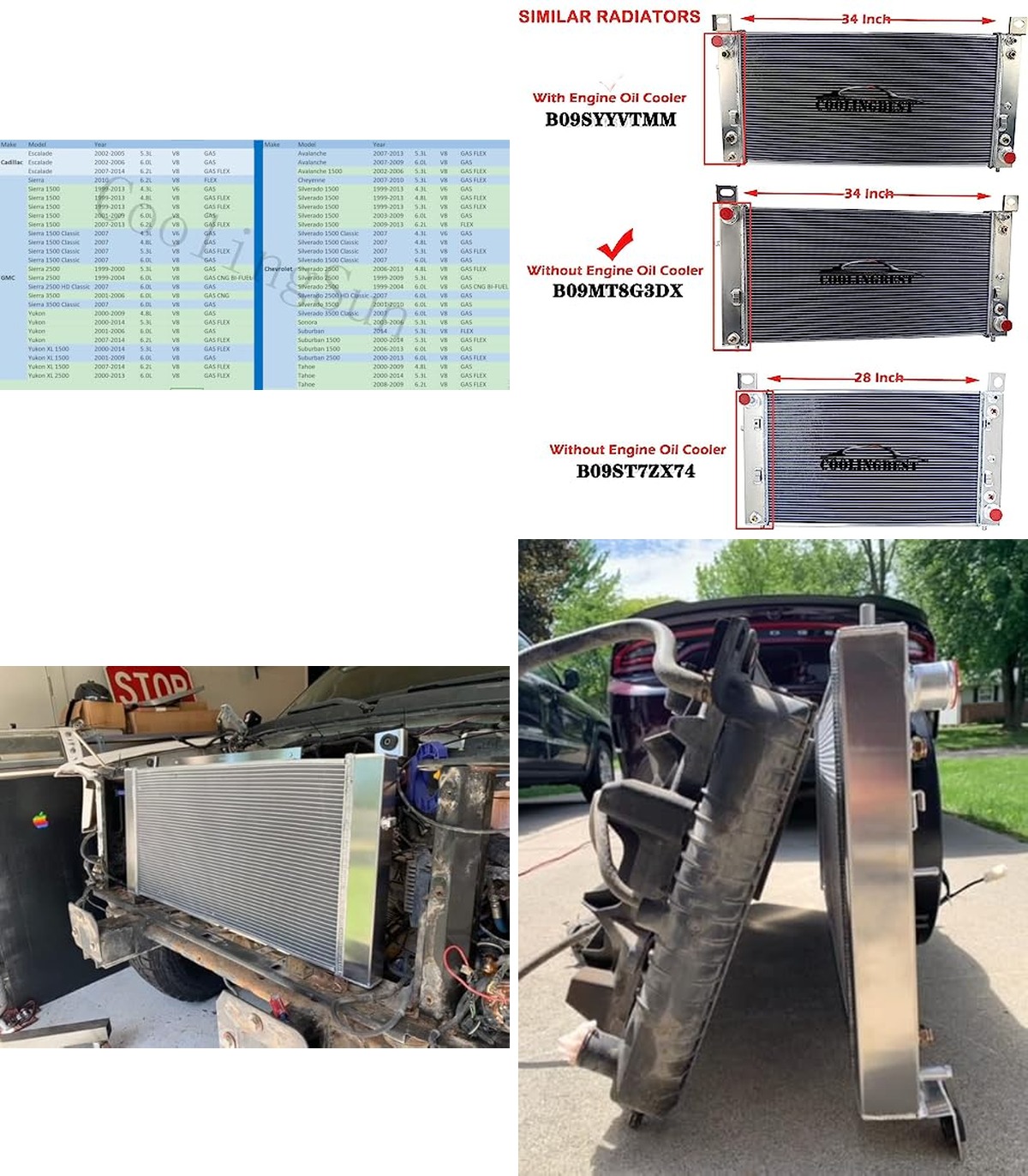Key FeaturesDirect fit for Chevy Silverado Suburban Tahoe Escalade 4.8L 5.3L 6.0L 6.2L V8. Shuttered design T-5052 fan shroud to guaranteed airflow passes high efficiently. Direct OE replacement with drop-in precise fitment and easy installation.OEM Fitment: Precisely manufactured to meet original equipment manufacturer (OEM) specifications. Advanced Sealing Technology: Utilizes state-of-the-art welding techniques and high-quality sealing materials. Enhanced Cooling Capacity: Features an increased surface area for improved heat exchange.Material – Aluminum – All of our products are made of the best materials and advanced manufacture technique to enchance cooling perfomance. Easy To Install: Light weight direct bolt-on replacement, stronger & higher capacity for coolant. This Aluminum Radiator is at least 30%-45% more efficient than stock ones.
