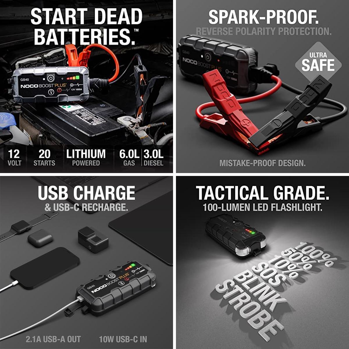 Product | NOCO Boost GB40: 1000A UltraSafe Jump Starter – 12V Lithium Battery Booster Pack, Portable Jump Box, Power Bank & Jumper Cables – for 6.0L Gas and 3.0L Diesel Engines NOCO | Scatach 011 3000A Car Battery Jump Starter,12V Jump Starter Battery Pack (up to 9.0L Gasoline and 7.0L Diesel Engine), Portable Jump Box with 3 Modes Flashlight and Jumper Cable Scatach | AstroAI S8 Car Battery Jump Starter, 1500A Peak Car Jumper Starter Battery Pack for Up to 6.0L Gas & 3.0L Diesel Engines, 12V Portable Jump Box with 3 Modes Flashlight and Jumper Cable (Orange) AstroAI |