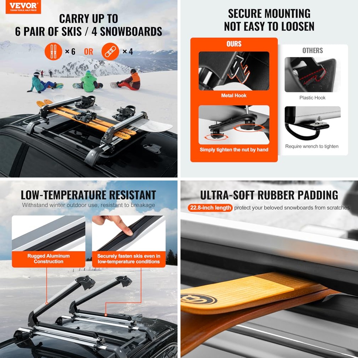 Product | VEVOR Universal Car Roof Rack – Fit Most Crossbars, Carry up to 6 Pairs of Skis or 4 Snowboards, Aluminum Snowboard Ski Rack with Lock & Rubber Padding VEVOR | Yakima Ski & Snowboard Car Roof Rack, Fits 6 Ski Pairs or 4 Boards, PowderHound 6 Yakima | Alpinista Ski & Snowboard Rack for Car Roof with Sliding Extension, Snowboard Roof Rack Fits 5 Ski Pairs or 4 Snowboards, Aluminum, Universal for Square/Rectangular/Aero Bars Alpinista |