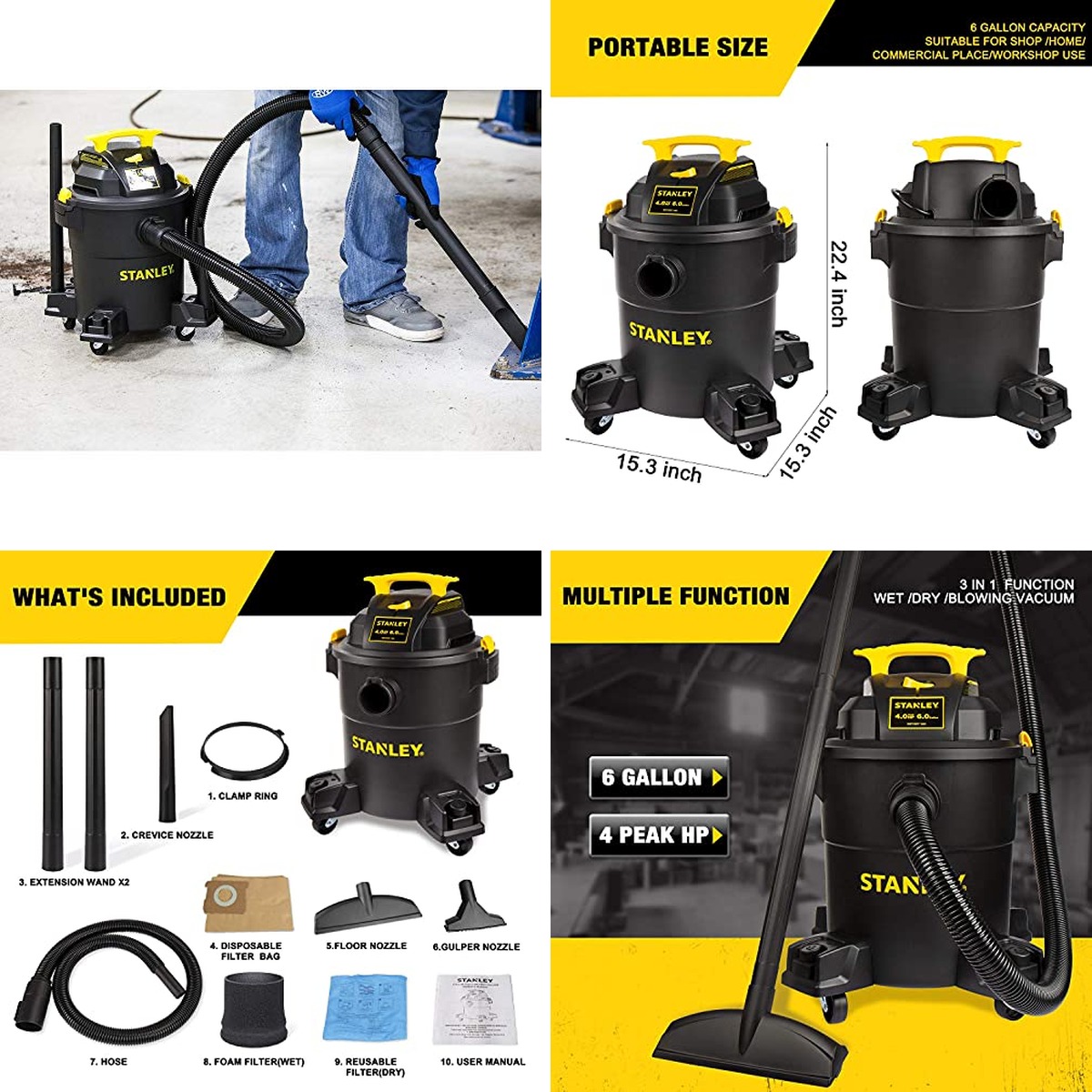 Product | Stanley – SL18116P Wet/Dry Vacuum, 6 Gallon, 4 Horsepower Black STANLEY | CRAFTSMAN CMXEVBE17250 2.5 Gallon 2.5 Peak HP Wet/Dry Shop Vac, Portable Shop Vacuum Wet and Dry with Filter Bag, Hose and Attachments for Cleaning in the Home CRAFTSMAN | Shop-Vac 5989305 Wet/Dry Vacuum, 5 Gallon, 4.5 Peak HP Stainless Steel Vacuum, 1.25 Inch Diameter x 7 Foot Hose, 6 Ft Cord Length, Ideal for Jobsite, Garage, Car & Workshop Shop-Vac |
