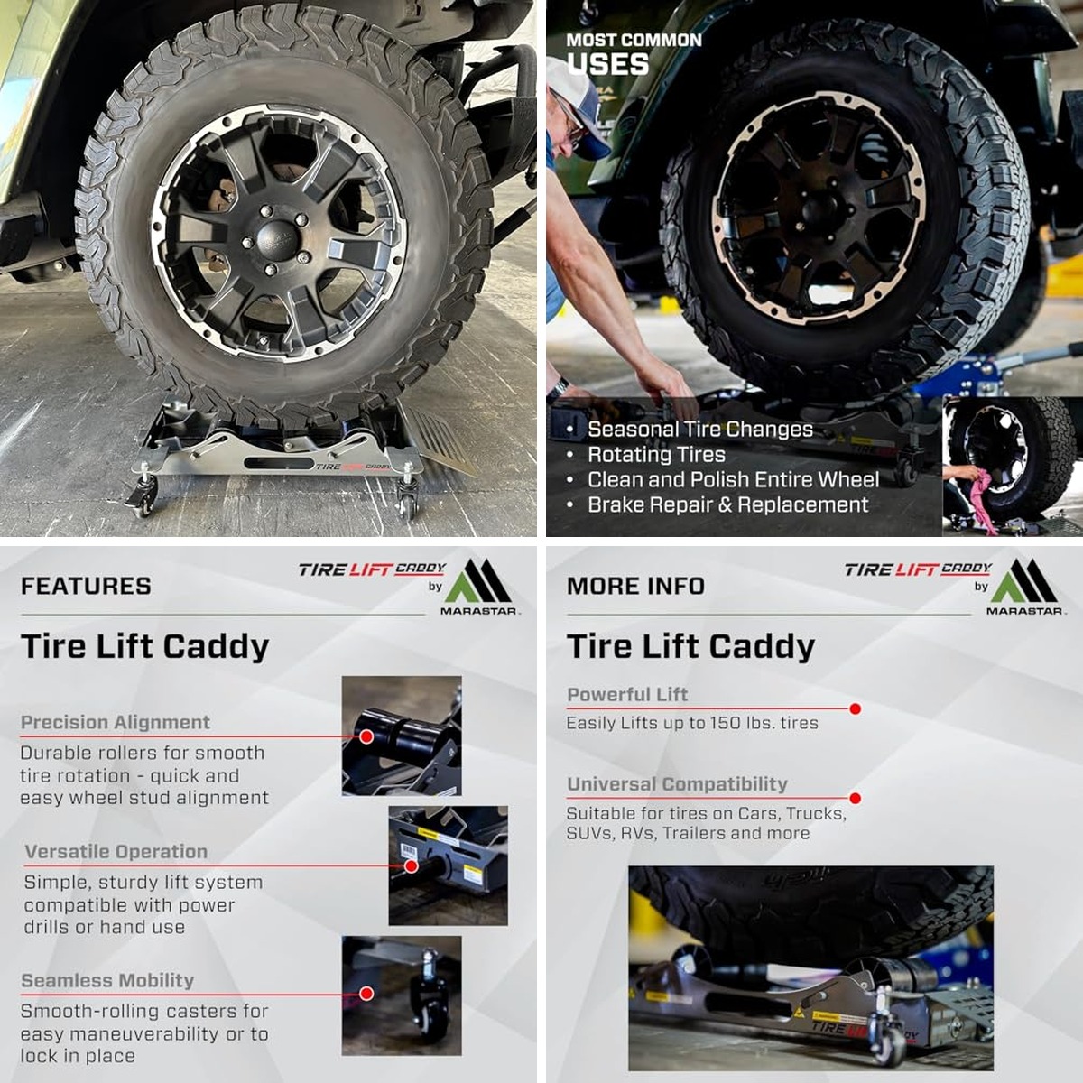 Key Features• Easily lift up to 150 lbs. tires; Universal Compatibility; Precision Alignment; Seamless Mobility & Stability; Robust Design and Effortless Loading; No Assembly Required.• Effortless tire changing and rotation; Easy to use with a roller plate for alignment; Compact and portable design; Rugged construction.• Wide compatibility with GM vehicles (2006-2023); Saves time and money; Essential and easy to use; Superior quality and performance; Maximizes safety.
