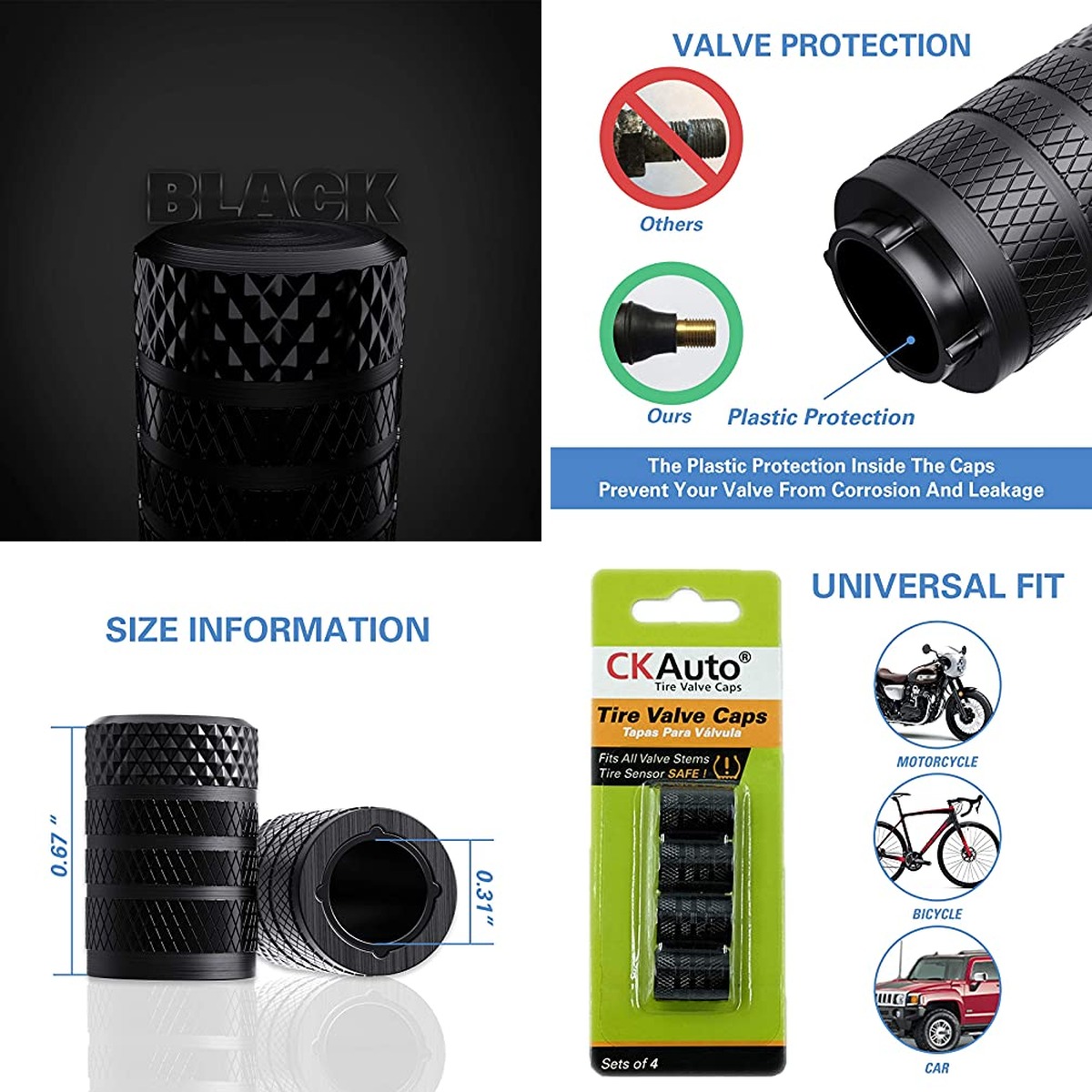 Product | CKAuto Tire Valve Stem Caps, Black, 4 pcs/Pack, Anodized Aluminum Tire Valve Cap Set, Corrosion Resistant, Universal Stem Covers for Cars Trucks Motorcycles SUVs and Bikes CKAuto | Tire Valve Stem Caps The Upgraded Version has a Sealing Ring for Car, Motorbike, Trucks, Bike, Bicycle (Black) (24) DENSET | The Upgraded Version has a Sealing Ring Tire Valve Stem Caps (12pcs Black) Augystre |