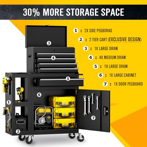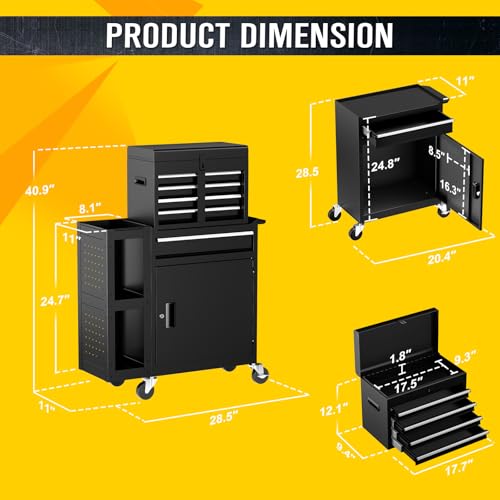 BSMTEK 5-Drawers Rolling Tool Chest with Wheels, Exclusive 3-in-1 Tool Box Combo with Removable 2-Tire Utility Cart, 30% Extra Storage Rolling Tool Cabinet for Garage Workshop, 29”W x 11”D x 41”H