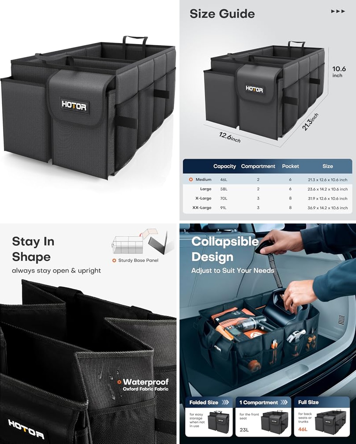 Product | HOTOR Trunk Organizer – Car Organizer, Foldable Trunk organizer for SUVs & Sedans, Sturdy Car Organization for Car Accessories, Tools, Sundries, Black, 2 Compartments, 21.3"×12.6"×10.6" HOTOR | HOTOR Trunk Organizer – Car Organizer with Built-In Leakproof Car Cooler, Collapsible Trunk Organizer with Cooler for Car, SUV, Sedan, with Base Panel (3 Compartments, Black),31.9"×12.6"×10.6" HOTOR | Simple Deluxe Car Trunk Organizer, Collapsible Storage Box with 2 Compartments & Anti-Slip Bottom, Waterproof 600D Oxford Polyester for SUV, Minivan, Truck, Red, 2 Pack Simple Deluxe |